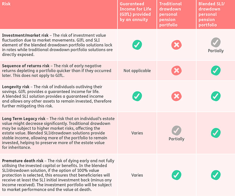 Both solutions have different uses for clients depending on individual needs and objectives. The table below outlines ways each solution can help mitigate retirement risks: